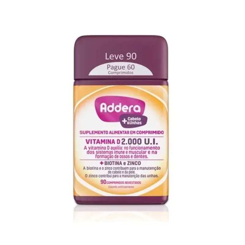 Addera + Cabelo e Unhas 2.000UI é um suplemento vitamínico poderoso que visa fortalecer e revitalizar seus cabelos e unhas. Cada frasco contém 30 comprimidos, cuidadosamente formulados com vitaminas, minerais e nutrientes essenciais.