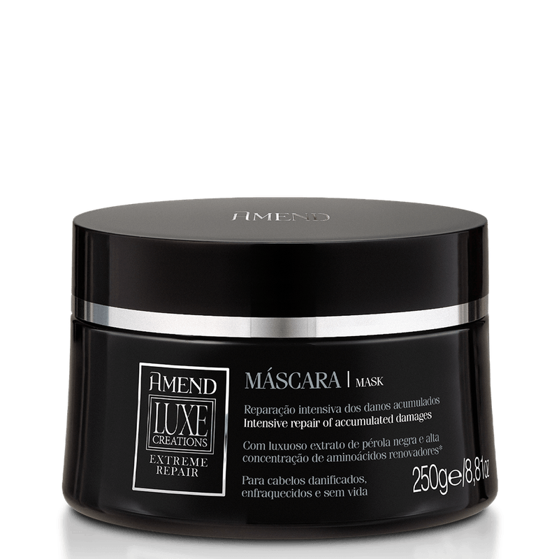 Amend LUXE Creations Extreme Repair máscara de reparação intensiva dos danos acumulados, com luxuosos extrato de pérola negra e alta concentração de aminoácinos renovadores, reapara os cabelos estressados e sem vida. Máscara Luxe Creations Extreme Repair 250g Nutre intensamente combinando um Sistema de Aminoácidos que repõem a estrutura natural dos fios, agindo como um reforçador interno do cabelo e reparando os danos acumulados. Com alta concentração de ativos que combatem os sinais de envelhecimento capilar (cabelos opacos, fracos e desidratados), evitam o desbotamento da cor e recuperam rapidamente os fios, mantendo-os hidratados, fortes, brilhantes e blindados de futuras agressões. Indicação: Para cabelos estressados e sem vida. Principais Ativos: Extrato de Pérola Negra e Aminoácidos Renovadores. Ação: Nutre intensamente e repõe a estrutura natural dos fios, agindo como um reforçador interno e reparando os danos acumulados. Com alta concentração de ativos que combatem os sinais de envelhecimento capilar (cabelos opacos, fracos e desidratados), evitam o desbotamento da cor e recuperam os fios, mantendo-os hidratados, fortes, brilhantes e blindados contra futuras agressões. Modo de Uso Após lavar os cabelos com o Shampoo Amend, retire o excesso de água com uma toalha e aplique a máscara do comprimento dos fios até as pontas, massageando mecha por mecha. Deixe agir por 03 minutos. Enxágue bem. Se desejar, aplique a seguir o condicionador para selar as cutículas. Precauções: Mantenha fora do alcance de crianças, em lugar fresco e ao abrigo de luz intensa. Não ingerir. Em caso de contato com os olhos, enxaguar imediatamente com água abundante. USO EXTERNO.
