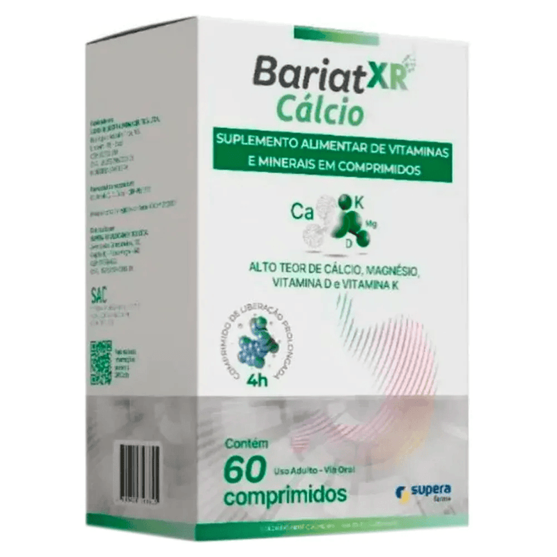 Bariat XR Cálcio é o suplemento alimentar com alto teor de cálcio, ideal para o paciente bariátrico pois alia a exclusiva tecnologia de liberação prolongada com uma formulação única (1.000 mg de cálcio), facilitando a adesão e disponibilidade dos minerais e vitaminas para manutenção da saúde, além de possuir menos efeitos colaterais associados aos suplementos de cálcio.