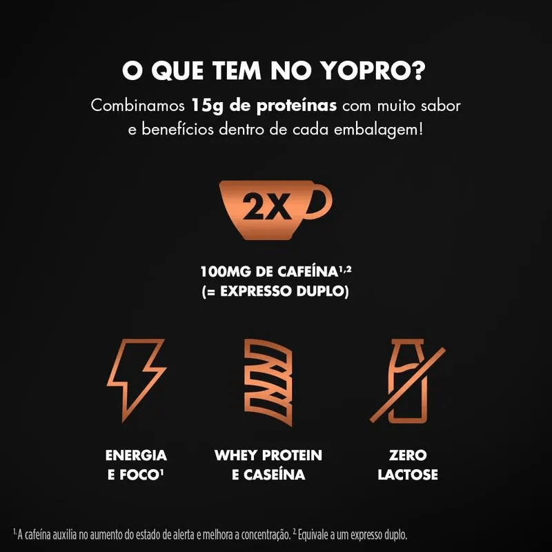 YoPRO é uma forma prática e gostosa de incluir a proteína na rotina, principalmente para os praticantes de atividades físicas. Ele possui 15g de proteínas, com Whey + Caseína, é zero lactose, zero adição de açúcares e baixo teor de gorduras. Além disso, é fonte de cálcio e possui nutrientes que contribuem para recuperação muscular e saciedade, sendo uma opção para o pré e pós treino ou para um lanche ao longo do dia! Experimente!