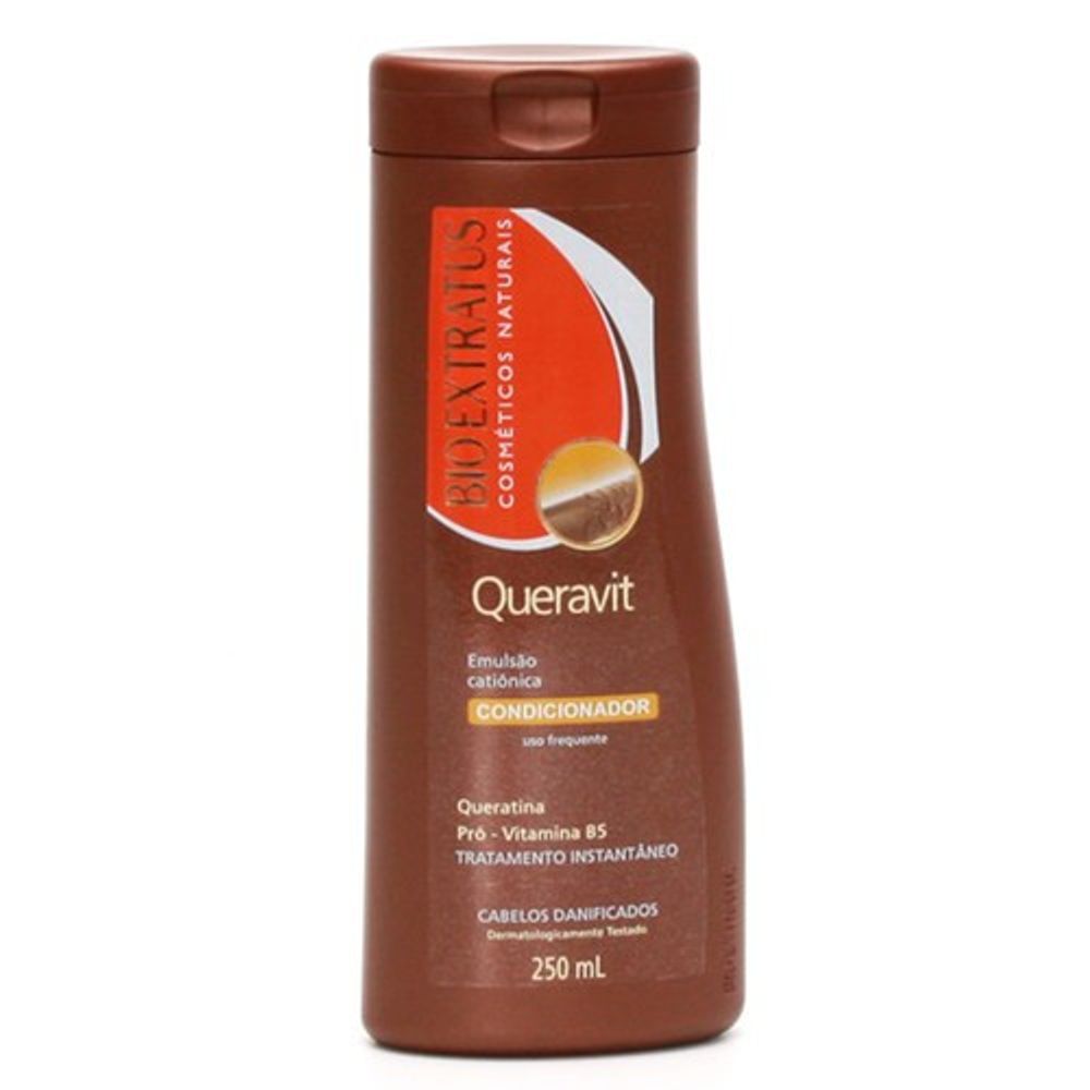 O Condicionador Queravit é rico em Queratina, Pró-Vitamina B5 e agentes catiônicos que reparam os danos causados na fibra capilar. Sua fórmula hidrata, desembaraça e nutre devolvendo forla e vitalidade aos cabelos. É indicado para Cabelos Danificados. Tem a função de reconstruir a queratina e fechar as cutículas, restaurando o brilho e a vitalidade dos cabelos danificados. Promove selagem imediata das cutículas capilares, recuperando os fios danificados. Possui ativos como: Romã - Normaliza a secreção da glândula sebácea. Confere nutrição e hidratação aos fios. Desintoxica as fibras capilares e deixa os fios mais soltos. Pró Vitamina B5 - Atua diretamente no couro cabeludo e nas fibras capilares. Auxilia na retenção de umidade, evitando pontas bipartidas. Ajuda a reparar os danos causados por tratamentos químicos e agressões externas. Queratina Concentrada - Penetra na fibra capilar regenerando-a de dentro para fora, reconstruindo e fortalecendo os fios. Interage com as partes danificadas das cutículas do cabelo, reestruturando a fibra capilar. Silicone Amínico de Baixo Peso Molecular - Forma uma película protetora sobre os fios, ligando-se principalmente às regiões mais danificadas. Resultado Reestrutura Nutre Protege Condiciona Conselho de Aplicação Uso diário. Após lavar o cabelo com shampoo, aplique o condicionador por toda a extensão dos fios, massageando suavemente. Deixe agir de 1 a 2 minutos. Enxágue. Use também os outros produtos da Linha Queravit. Composição Queratina, Pró-Vitamina B5