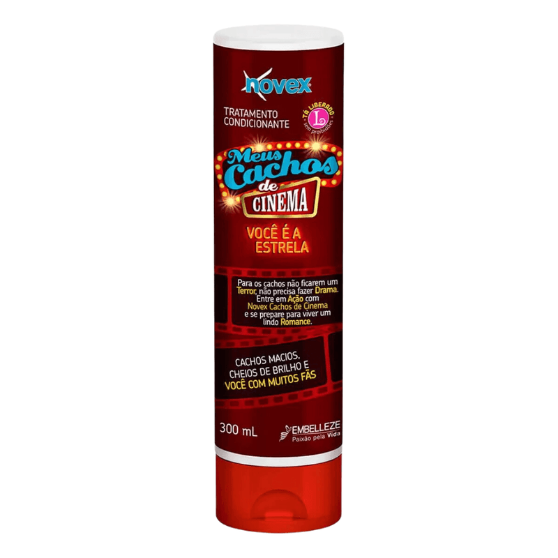 Após lavar os cabelos com o shampoo, aplique o condicionador nos fios úmidos, massageando suavemente. Deixe agir por alguns minutos e enxágue bem. Para melhores resultados, use a linha completa Novex Cacho Cinema.