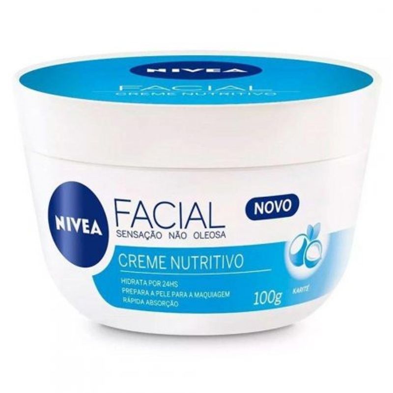Nivea Facial creme hidratante nutritivo com karité, não deixa sensação oleosa, hidrata por 24 horas, prepara a pele para a maquiagem, fórmula leve de rápida absorção. NOVO NIVEA Creme Facial Nutritivo, sua fórmula ultra leve com tecnologia Hydro-Waxes à base de água e Karité, proporciona hidratação intensa por 24horas sem deixar sensação oleosa e ainda prepara a pele para a maquiagem, para uma pele bonita e com aspecto saudável. Precauções: Uso externo. Evite contato com os olhos. Caso aconteça, enxágue com água em abundância. Em caso de irritação, suspenda o uso e procure orientação médica. Manter em local seco e arejado, ao abrigo de luz e fora do alcance de crianças. Este produto não é um protetor solar. Ingredientes: Aqua, Glycerin, Butyrospermum Parkii Butter, Cetyl Palmitate, Olus Oil, Cetyl Alcohol, Isopropyl Palmitate, Dimethicone, Sodium Polyacrylate, Phenoxyethanol, Linalool, Citronellol, Alpha-Isomethyl Ionone, Geraniol, Limonene, Parfum.