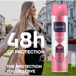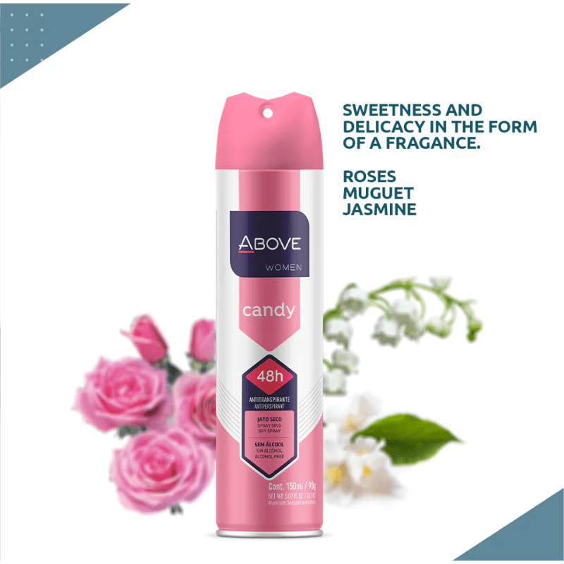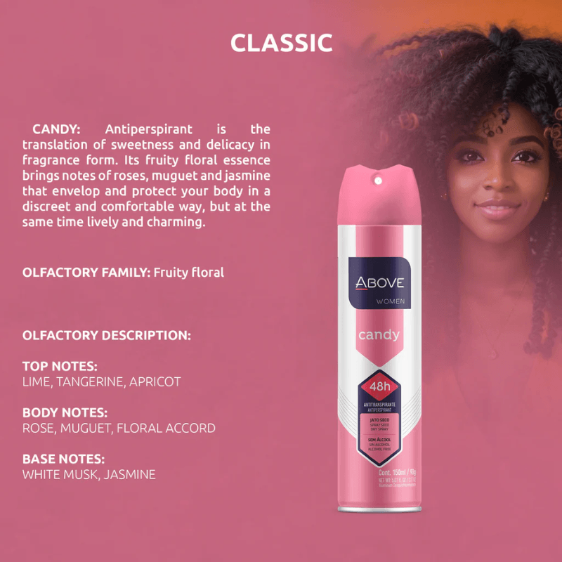O Above Women Candy é um desodorante aerossol feminino formulado com óleo de canela, que proporciona 48 horas de proteção contra o suor e o mau odor.