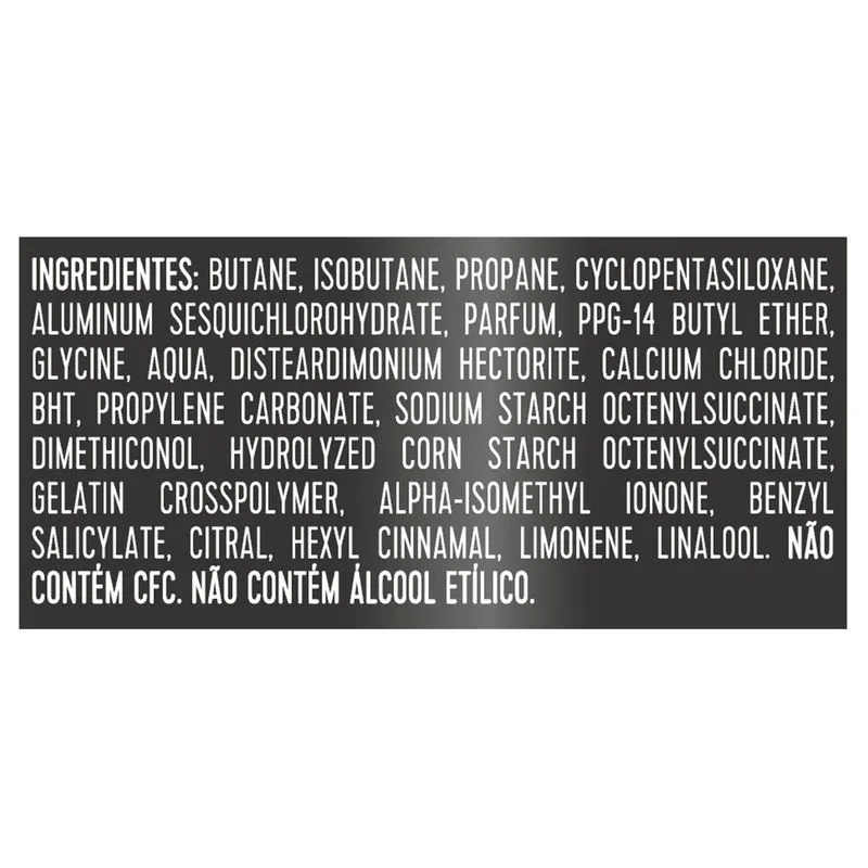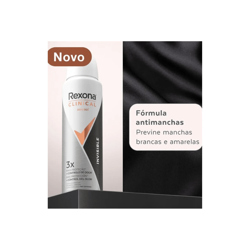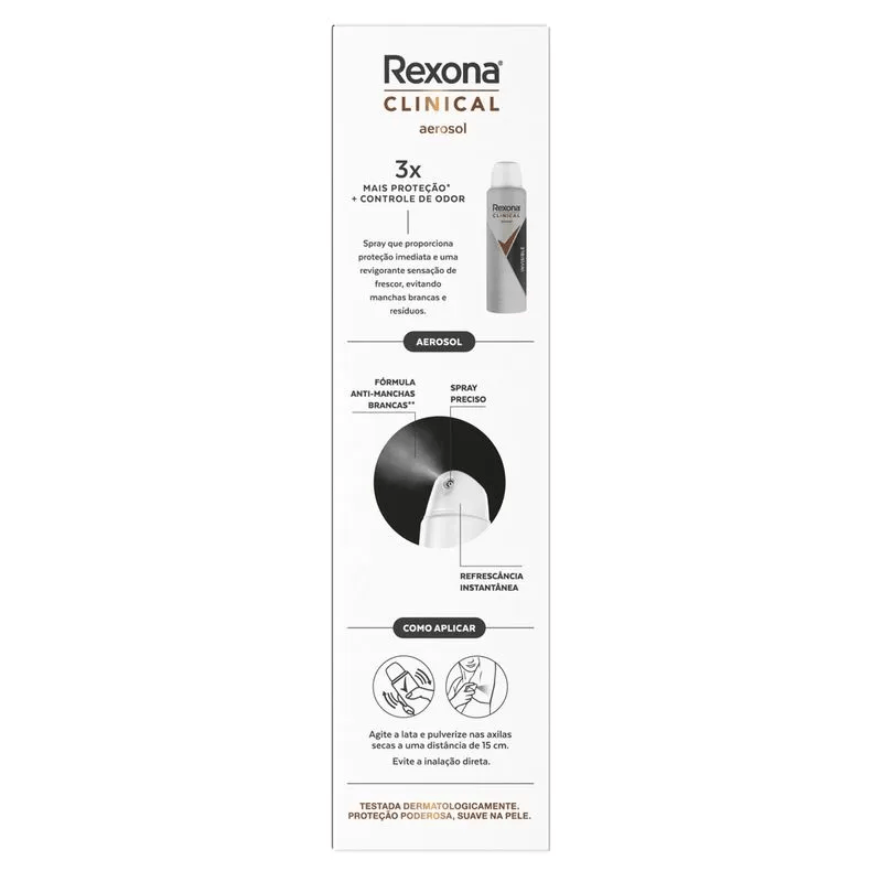 • O Desodorante Antitranspirante Aerosol Rexona Clinical Invisible Men garante 96h de proteção com fórmula antimanchas • Possui uma fórmula com 3x mais proteção* contra o suor e controle de odor que um antitranspirante comum • Desenvolvido com microtecnologia Pro-Defense, que previne o suor, neutraliza o mau odor e refresca • Rexona Clinical Invisible Men é dermatologicamente testado, e por isso gentil com a pele • Este desodorante possui uma agradável fragrância suave para você se sentir confiante e fresco o dia todo • O spray preciso deste antitranspirante aerosol proporciona proteção imediata e uma revigorante sensação de frescor Descubra a proteção poderosa e duradoura do Rexona Clinical Aerosol Invisible Men, o desodorante desenvolvido para quem precisa de performance máxima no dia a dia. Com 96 horas de proteção antitranspirante, ele proporciona uma sensação refrescante duradoura, mesmo nos momentos mais intensos. Sua fórmula exclusiva oferece 3x mais proteção* contra o suor em comparação com um antitranspirante comum, além de controlar o mau odor. Com a avançada microtecnologia Pro-Defense, Rexona Clinical atua junto ao seu corpo com uma resposta de tripla ação. Ele previne o suor com nosso ativo antitranspirante mais potente, neutraliza o mau odor liberando mais princípios ativos conforme o movimento, e refresca com moléculas de fragrância ativadas pelo suor – garantindo que você se sinta limpo, fresco e protegido durante todo o dia, mesmo sob calor, estresse ou esforço físico. Com formulação antimanchas, este desodorante antitranspirante aerosol foi especialmente desenvolvido para ajudar a prevenir manchas brancas de resíduos em roupas escuras e manchas amarelas em roupas claras. Além disso, é dermatologicamente testado, sendo eficaz e suave na pele. Sua fragrância suave e amadeirada, com notas de cedro, bergamota e baunilha é liberada de forma contínua graças às cápsulas de liberação controlada, mantendo você fresco e confiante o dia todo. O spray preciso garante uma aplicação uniforme e uma sensação de frescor instantâneo. Para melhores resultados, agite bem antes de usar e aplique nas axilas secas a uma distância de 15 cm. A aplicação noturna também é recomendada: a fórmula é ativada enquanto você dorme, entregando proteção ao longo do dia seguinte. *Vs um antitranspirante básico.