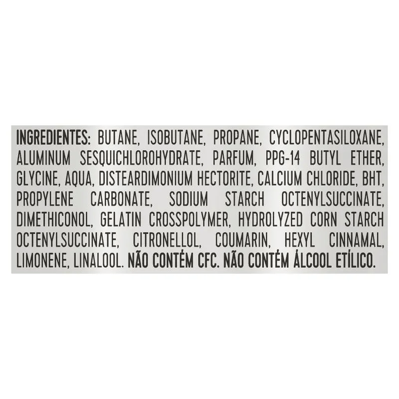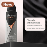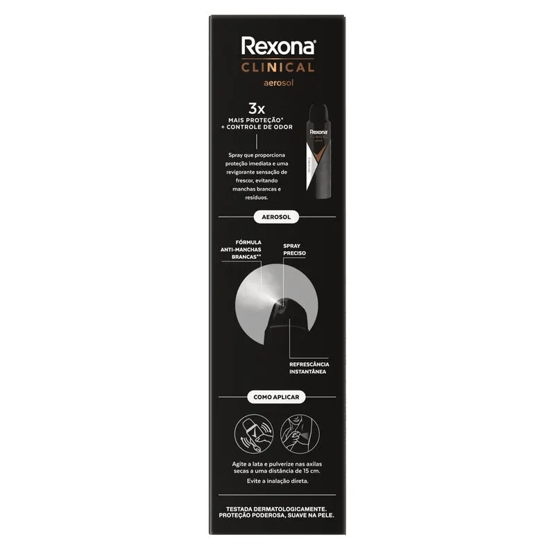 • O Desodorante Antitranspirante Aerosol Rexona Clinical Invisible Men garante 96h de proteção com fórmula antimanchas • Possui uma fórmula com 3x mais proteção* contra o suor e controle de odor que um antitranspirante comum • Desenvolvido com microtecnologia Pro-Defense, que previne o suor, neutraliza o mau odor e refresca • Rexona Clinical Invisible Men é dermatologicamente testado, e por isso gentil com a pele • Este desodorante possui uma agradável fragrância suave para você se sentir confiante e fresco o dia todo • O spray preciso deste antitranspirante aerosol proporciona proteção imediata e uma revigorante sensação de frescor Descubra a proteção poderosa e duradoura do Rexona Clinical Aerosol Invisible Men, o desodorante desenvolvido para quem precisa de performance máxima no dia a dia. Com 96 horas de proteção antitranspirante, ele proporciona uma sensação refrescante duradoura, mesmo nos momentos mais intensos. Sua fórmula exclusiva oferece 3x mais proteção* contra o suor em comparação com um antitranspirante comum, além de controlar o mau odor. Com a avançada microtecnologia Pro-Defense, Rexona Clinical atua junto ao seu corpo com uma resposta de tripla ação. Ele previne o suor com nosso ativo antitranspirante mais potente, neutraliza o mau odor liberando mais princípios ativos conforme o movimento, e refresca com moléculas de fragrância ativadas pelo suor – garantindo que você se sinta limpo, fresco e protegido durante todo o dia, mesmo sob calor, estresse ou esforço físico. Com formulação antimanchas, este desodorante antitranspirante aerosol foi especialmente desenvolvido para ajudar a prevenir manchas brancas de resíduos em roupas escuras e manchas amarelas em roupas claras. Além disso, é dermatologicamente testado, sendo eficaz e suave na pele. Sua fragrância suave e amadeirada, com notas de cedro, bergamota e baunilha é liberada de forma contínua graças às cápsulas de liberação controlada, mantendo você fresco e confiante o dia todo. O spray preciso garante uma aplicação uniforme e uma sensação de frescor instantâneo. Para melhores resultados, agite bem antes de usar e aplique nas axilas secas a uma distância de 15 cm. A aplicação noturna também é recomendada: a fórmula é ativada enquanto você dorme, entregando proteção ao longo do dia seguinte. *Vs um antitranspirante básico.