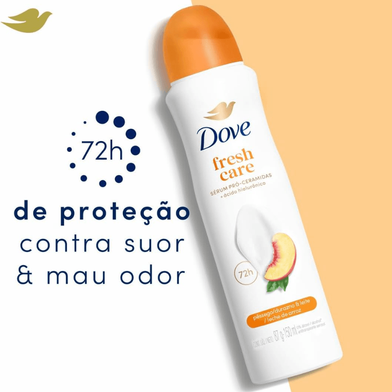 Dove Fresh Care Pêssego & Leite de Arroz hidrata e ajuda a pele das axilas a se recuperar das microlesões causadas pela depilação. Sua fórmula contém 1/4 de creme hidratante, para axilas mais macias e suaves, e é livre de álcool etílico, evitando irritação na pele.
