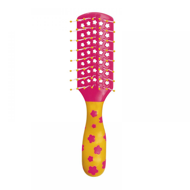 Cabo emborrachado em alto relevo Pinos de nylon com pontas arredondadas Não machucam o couro cabeludo Cores sortidas: azul, verde, rosa ou laranja