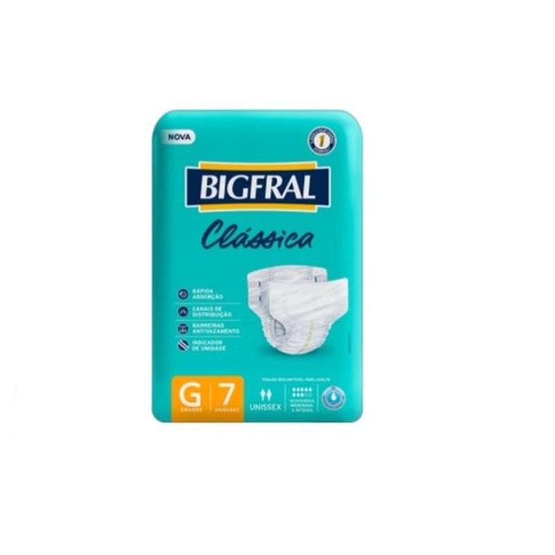 O pacote contém 7 unidades da Fralda Geriátrica Bigfral Classic G, proporcionando praticidade para experimentar ou para atender às suas necessidades. A Bigfral é uma marca renomada, conhecida por sua qualidade e compromisso em fornecer produtos confiáveis para o cuidado dos idosos.