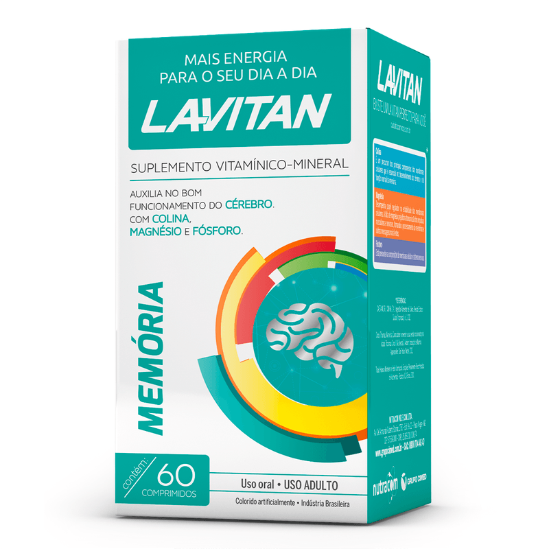 Lavitan Memória é um suplemento de vitaminas e minerais que auxilia no bom funcionamento do cérebro. Possui as vitaminas C, B12, B6, ácido fólico, o selênio e o zinco auxilia no funcionamento do sistema imune. A vitamina C, E, o selênio e o zinco são antioxidantes que auxilia na proteção dos danos causados pelos radicais livres. A colina contribui para o metabolismo lipídico.