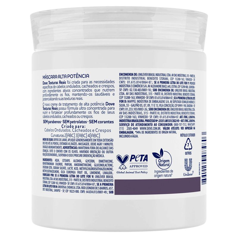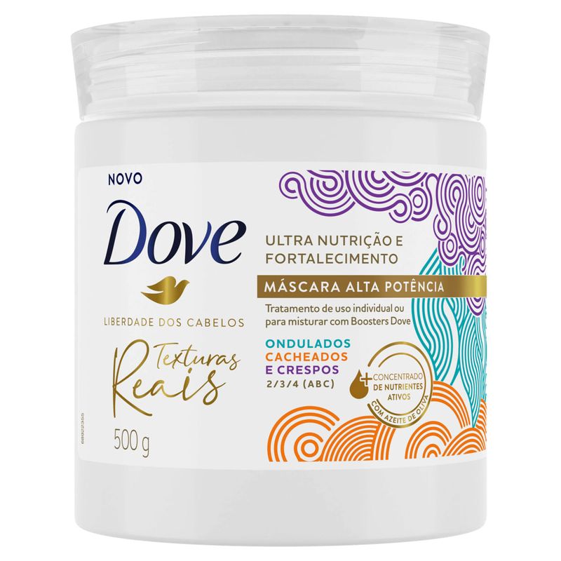 A linha Dove Liberdade dos Cabelos Texturas Reais foi desenvolvida especialmente para o cuidado dos cabelos ondulados, cacheados e crespos. Sua fórmula conta com Azeite de Oliva e nutrientes ativos concentrados que nutrem profundamente os fios, mantendo-os saudáveis e potencializando suas texturas reais. A Máscara de Tratamento Dove Texturas Reais é de alta potência e promove ultra desembaraço, nutrição e fortalecimento e deve ser usada para a hidratação dos cabelos ondulados, cacheados e crespos tipo 2/3/4 (A B C).
