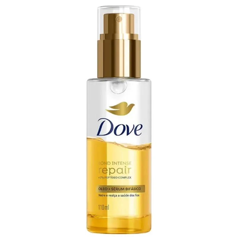 O Óleo + Sérum Bifásico Dove Bond Intense Repair possui a tecnologia patenteada Bio-Protein Care, proteína 100% compatível com a estrutura natural do cabelo, que age em harmonia com a biologia capilar e reverte os sinais do dano; e 7% Peptídeo Complex, microcomponentes da proteína que conseguem atingir as camadas mais internas da fibra para restaurar as ligações rompidas a nível molecular. Juntos, proporcionam uma selagem nutritiva e um brilho extra aos cabelos. A sua fórmula bifásica (água + óleo) é infusionada com micromoléculas de óleos, que garantem hidratação e nutrição profundas, realçando a saúde do cabelo danificado. O óleo finalizador Dove Bond Intense Repair oferece 10 benefícios transformadores*: 1. cabelos 4x mais macios; 2. controla o frizz por 72 horas; 3. brilho extremo por 48 horas; 4. blindagem antiumidade; 5. proteção contra o calor e UV; 6. nutre e devolve o movimento natural; 7. reduz 91% de pontas duplas; 8. protege as ligações capilares contra danos futuros; 9. realça a cor; 10. possui uma textura ultraleve de rápida absorção. Este produto está indicado para todos os tipos de cabelo. Para melhores resultados, experimente também outros produtos de cabelo Dove Bond Intense Repair. A Linha Dove Bond Intense Repair, com sua tecnologia patenteada, apresenta o melhor da ciência de Dove para o cabelo danificado ao reparar o cabelo a nível molecular, deixando os fios mais fortes, mais macios e com brilho extra. Globalmente, Dove não testa seus produtos em animais. *Com o uso do Shampoo, Condicionador e Óleo da linha, comparado com Shampoo sem agentes condicionantes.