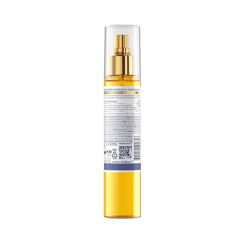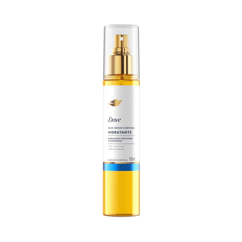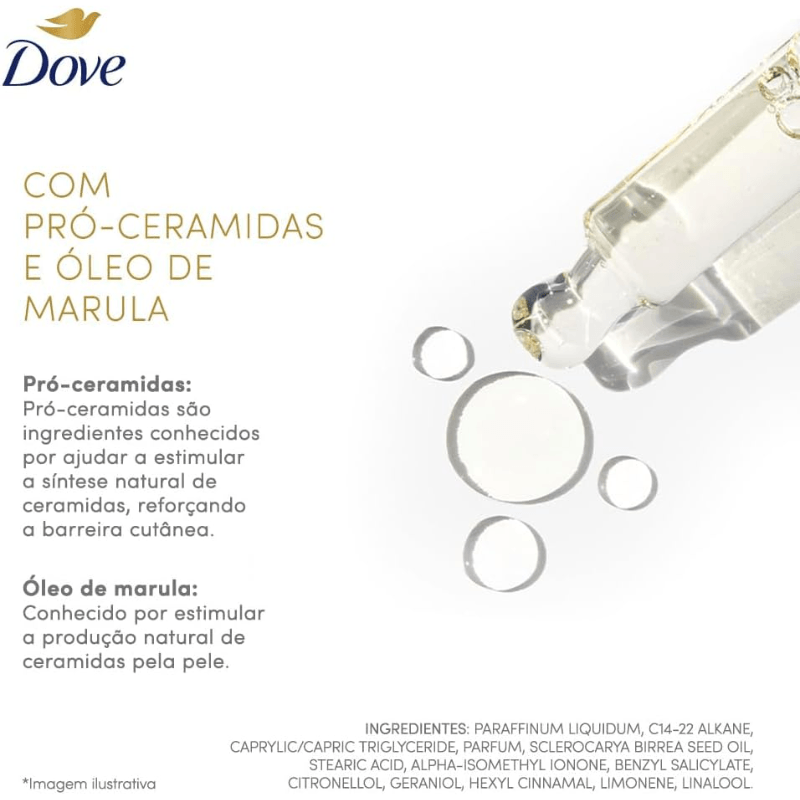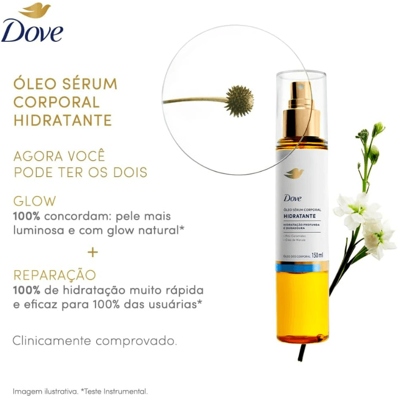 • Sobre a fragrância: notas de jasmim revelam feminilidade e notas de maçã verde, frescor. Um floral frutado que perfuma e inspira confiança. • Sobre o sensorial: óleo corporal com uma experiência sensorial única com rápida absorção e textura leve sem deixar a pele pegajosa. • Sobre o benefício: pele iluminada + hidratação profunda e duradoura por 48h* *Teste clínico. Resultados podem variar. • Sobre a reparação na pele: sérum corporal que promove hidratação profunda, prolongada e pele visivelmente mais macia e luminosa através da fórmula com Pro-Ceramidas e Óleo de Marula. • Sobre a hidratação: Dove Óleo Sérum Corporal Hidratante oferece hidratação profunda e duradoura por até 48h, revitaliza e previne a perda de água, ajudando a manter a pele saudável e protegida. • Fórmula clinicamente e dermatologicamente testada. Experimente o poder do Dove Óleo Sérum Corporal Hidratante, a combinação perfeita de hidratação intensa e tecnologia para seu corpo. Com Pro-Ceramidas e Óleo de Marula, este óleo corporal atua prevenindo a perda de hidratação por até 48 horas. O Dove óleo sérum corporal tem textura leve e rápida absorção, deixando a pele macia, suave e sem sensação oleosa. Você não precisa escolher entre glow e reparação, agora sua pele pode ter os dois em um só produto. Com um aplicador em spray que oferece praticidade, aplicação rápida e uniforme, o Dove Óleo Sérum Corporal Hidratante proporciona uma experiência sensorial sofisticada, ideal para o cuidado diário. Hidratação prolongada, pele nutrida e luminosa desde a primeira aplicação. Inclua o Dove óleo sérum corporal em seu ritual de cuidados e descubra uma pele surpreendentemente revitalizada em todas as estações do ano. Clinicamente e dermatologicamente testada. 100% das consumidoras sentiram uma hidratação rápida e eficaz.* 9 em cada 10 mulheres consideram o produto eficaz contra o ressecamento da pele.** 8 entre 10 consumidoras disseram que a pele ficou muito macia e suave.*** *Teste instrumental. **Teste de percepção. ***Teste de percepção. Em comparação com a pele antes do uso. Altura (com tampa): 197 mm. Capacidade: 150 ml.