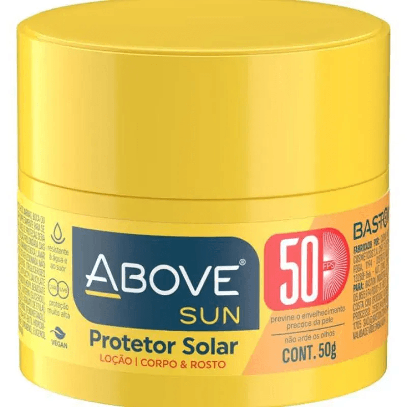 protetor solar Above FPS 50 - 50g Creme corpo e rosto Proteja sua pele dos danos solares com o Protetor Solar Above FPS 50. Este creme é ideal para o uso diário, oferecendo proteção eficaz contra os raios UVA e UVB, prevenindo o envelhecimento precoce e queimaduras. Benefícios: Alta proteção: Com FPS 50, garante uma defesa robusta contra os raios solares. Textura leve: Sua fórmula não oleosa é rapidamente absorvida, proporcionando conforto ao longo do dia. Hidratação: Enriquecido com ingredientes hidratantes, mantém a pele macia e saudável. Modo de Uso: Aplique generosamente sobre a pele do corpo e rosto antes da exposição ao sol. Reaplique a cada 2 horas, ou após nadar ou suar, para garantir a máxima proteção. Ideal para todos os tipos de pele, o Protetor Solar Above é o seu aliado na luta contra os danos causados pelo sol. Não comprometa a saúde da sua pele, experimente e sinta a diferença! Conteúdo: 50g