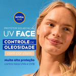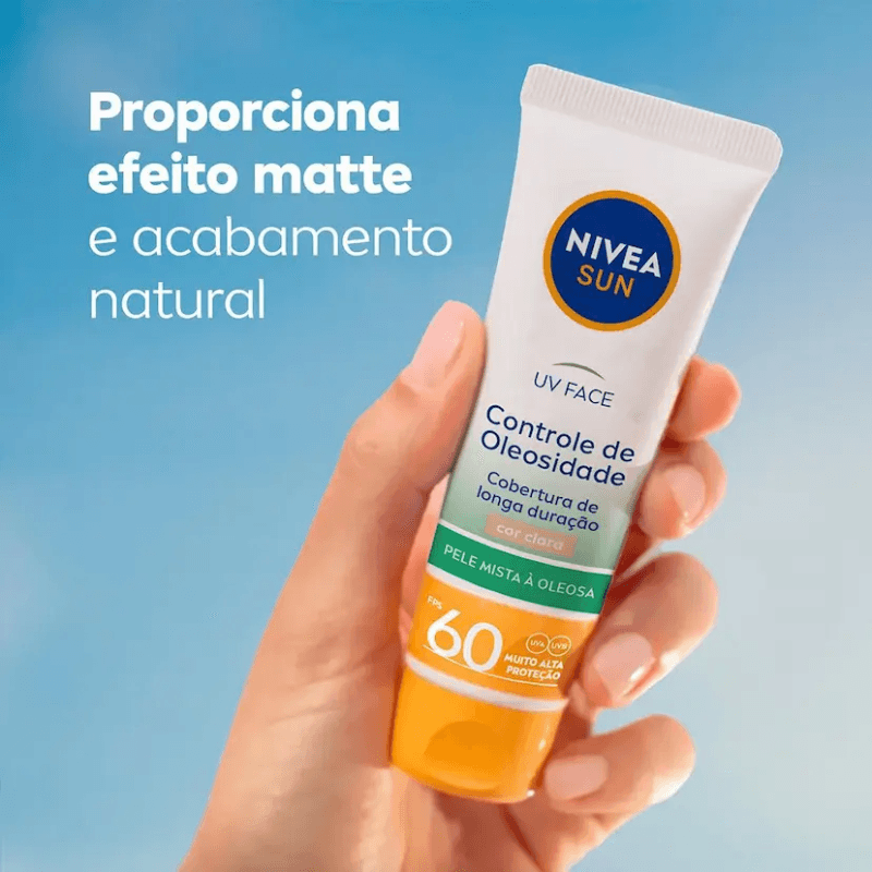 NIVEA Sun UV Face Controle de Oleosidade é um protetor solar de cor clara com alta proteção que, além de não obstruir os poros, controla a oleosidade da pele, mantendo a aparência sequinha ao longo do dia.