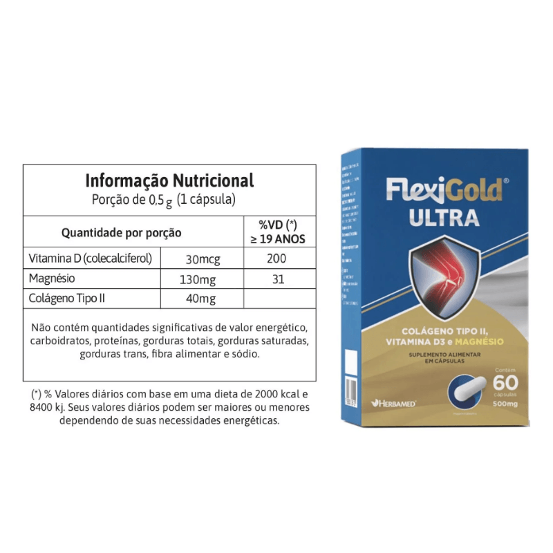 Suplemento alimentar Flexigold HA em cápsulas contendo Colágeno Tipo 2, Ácido Hialurônico, Vitamina C, Vitaminas D e Manganês, você pode contribuir para a formação dos músculos e ossos, melhorar o funcionamento do sistema imunológico e do metabolismo energético, além de ajudar a manter a saúde dos ossos e músculos.